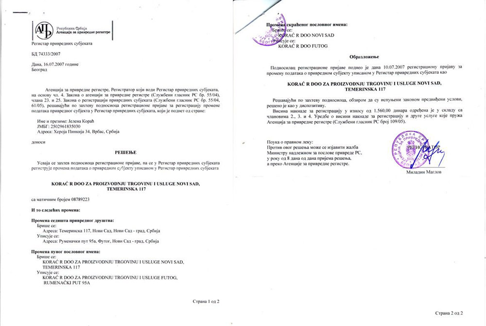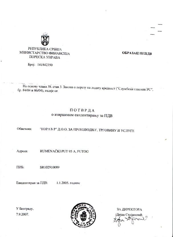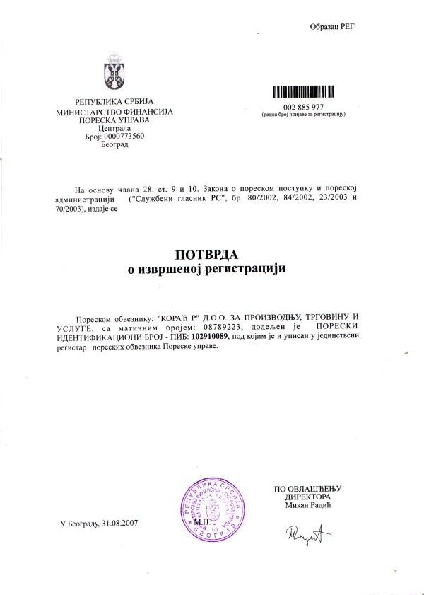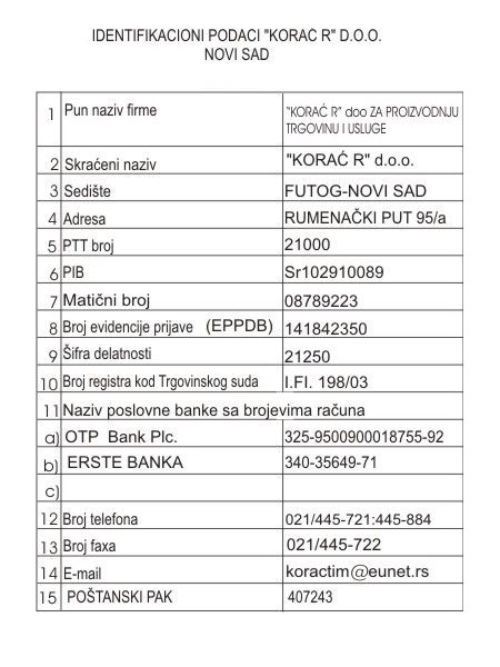 Kontaktdizajn242025-04-03T09:30:36+00:00 Kontaktirajte nas 021-445-721 021-445-772 021-445-884 Administracija Komercijala Dejan Radonić 📱 060-445-7215 📱 064-1-535-787 📧 moc.liamgobfsctd@mitcarok Komercijala Aleksandra Bakić 📱 060-445-7211 📧 moc.liamgobfsctd@3mitcarok Komercijala Miloš Korać 📧 moc.liamtohobfsctd@epatcarok Komercijala Jelena Korać 📧 sr.tenueobfsctd@mitcarok Korać R doo - Podaci firme Rumenački put 95aNovi Sad 21000, Srbija Dokumenta Rešenje o Upisu u APR SrbijeIdentifikacija za PIBPotvrda o evidentiranju za PDVIdentifikacioni podaciKorac Tape Preuzmite PDV identifikacija Vaša poruka je uspešno poslata Izaberite temu Proizvodi Isporuka Plaćanje Ostalo Pošalji poruku